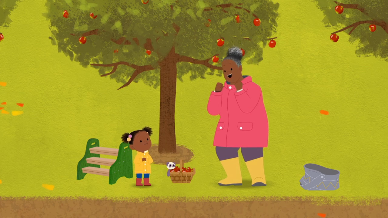 In JoJo and Gran Gran Harvest Fruit, JoJo and her grandmother are at a harvest festival. They pick apples and rhubarb and make a fruit crumble with the fruit they’ve harvested. Real-life friends visit an apple orchard to harvest apples. This video is excerpted from BBC’s JoJo & Gran Gran, a children's animated television series following JoJo, an inquisitive and cheerful 4-and-a-half-year-old girl and her loving Gran Gran, who always has something new to teach her.