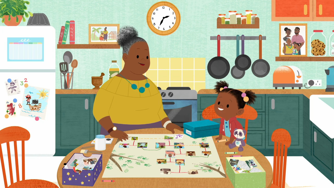 In JoJo and Gran Gran Make a Family Tree, JoJo and her grandmother use family photos to make a family tree. A real-life family uses handprints and paint to create their family tree. This video is excerpted from BBC’s JoJo & Gran Gran, a children's animated television series following JoJo, an inquisitive and cheerful 4-and-a-half-year-old girl and her loving Gran Gran, who always has something new to teach her.