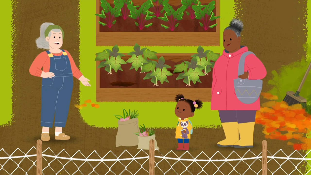 In JoJo and Gran Gran Visit the Community Garden, JoJo and her grandmother head to the local allotment, or community garden, to harvest some vegetables. Real-life children visit a community garden to see the vegetables that grow there. This video is excerpted from BBC’s JoJo & Gran Gran, a children's animated television series following JoJo, an inquisitive and cheerful 4-and-a-half-year-old girl and her loving Gran Gran, who always has something new to teach her.