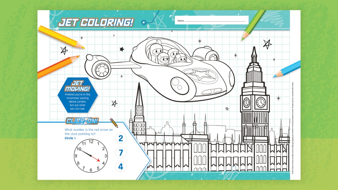 Flying over London in a jet? What a view! Can you figure out what time Big Ben is showing? Pretend you’re in the Vroomster soaring above London. Act out what you can see.
