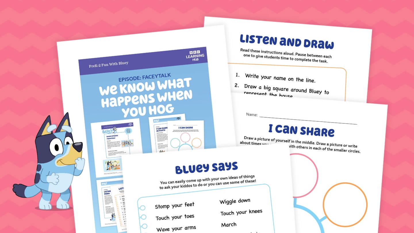 This fun lesson uses the Bluey episode "Faceytalk" as the kickoff to a classroom conversation about the importance of listening and sharing. Because we all know what happens when you hog! The lesson includes printables for three activities in which kids use a bubble map to brainstorm five different ways to share, listen to complete a directed drawing of Bluey in front of her house, and play a Bluey twist on Simon Says.