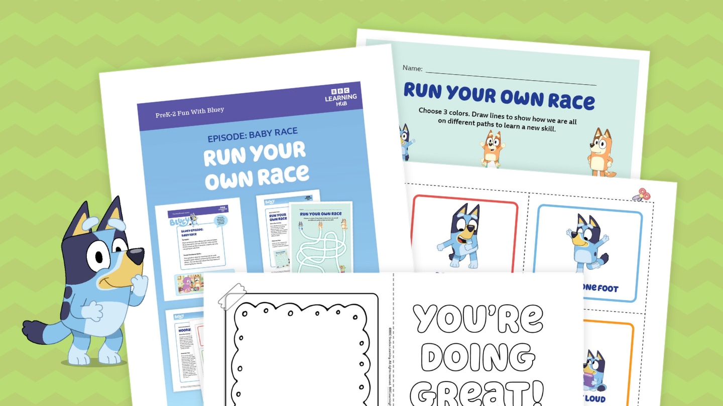 This fun lesson uses the Bluey episode "Race" as the kickoff to a classroom conversation about what it means to run your own race. It's important not to compare ourselves with others, and we also need to learn how to cheer on our friends. The lesson includes printables for three activities in which kids complete a maze to help Bingo, Bluey, and Mum on their own paths to learn different skills, cheer for each other as they complete different tasks, and make cards for someone who's been working hard.