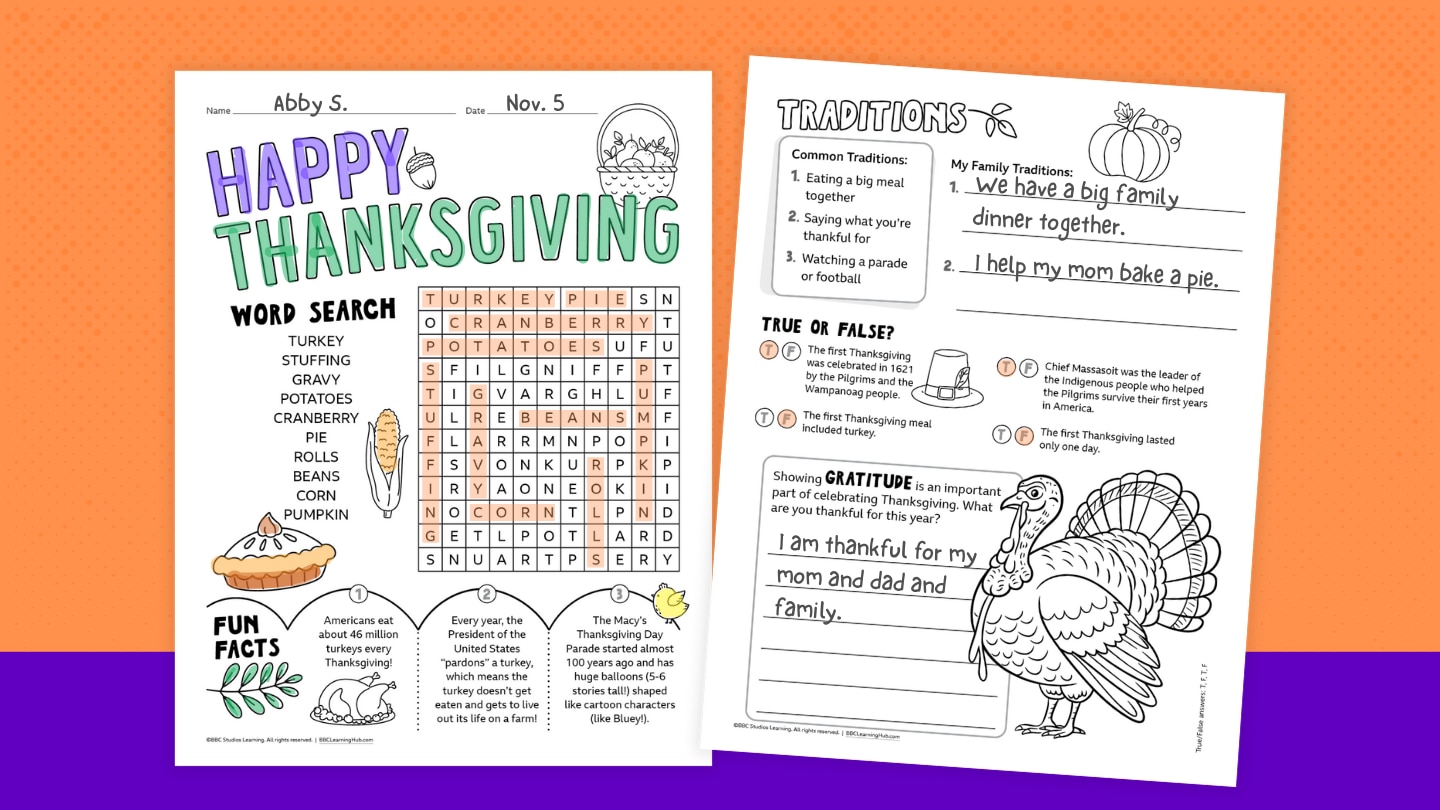Elementary-aged kids can do a Thanksgiving food word search, write about their family holiday traditions, try their hand at Thanksgiving History True or False?, and write what they're thankful for. They'll also learn fun facts like how the President of the United States pardons a turkey each year. Bonus: the whole thing is a coloring page!