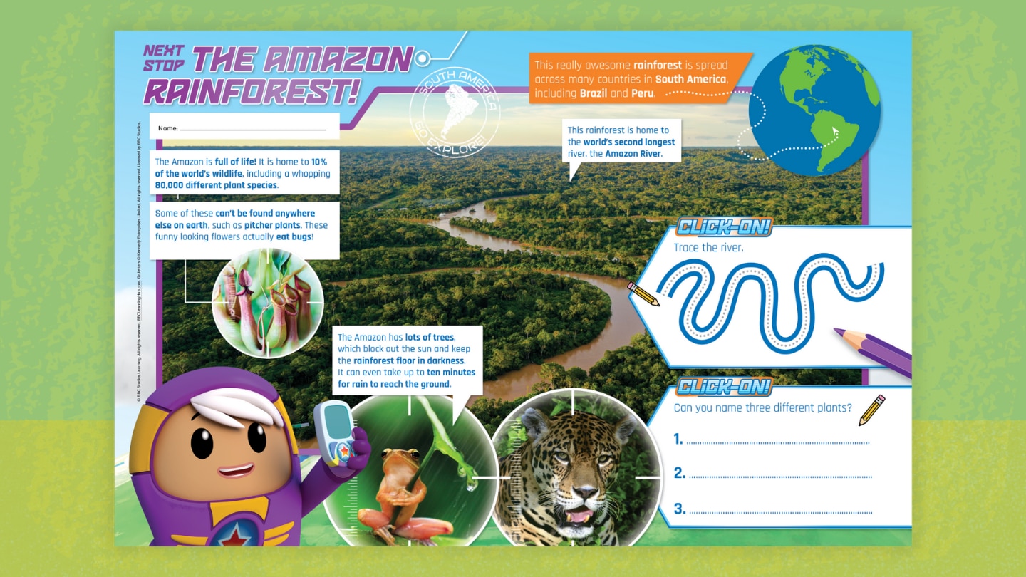 Join the Go Jetters in learning about the wonders of the Amazon rainforest. In this fun worksheet, you'll: