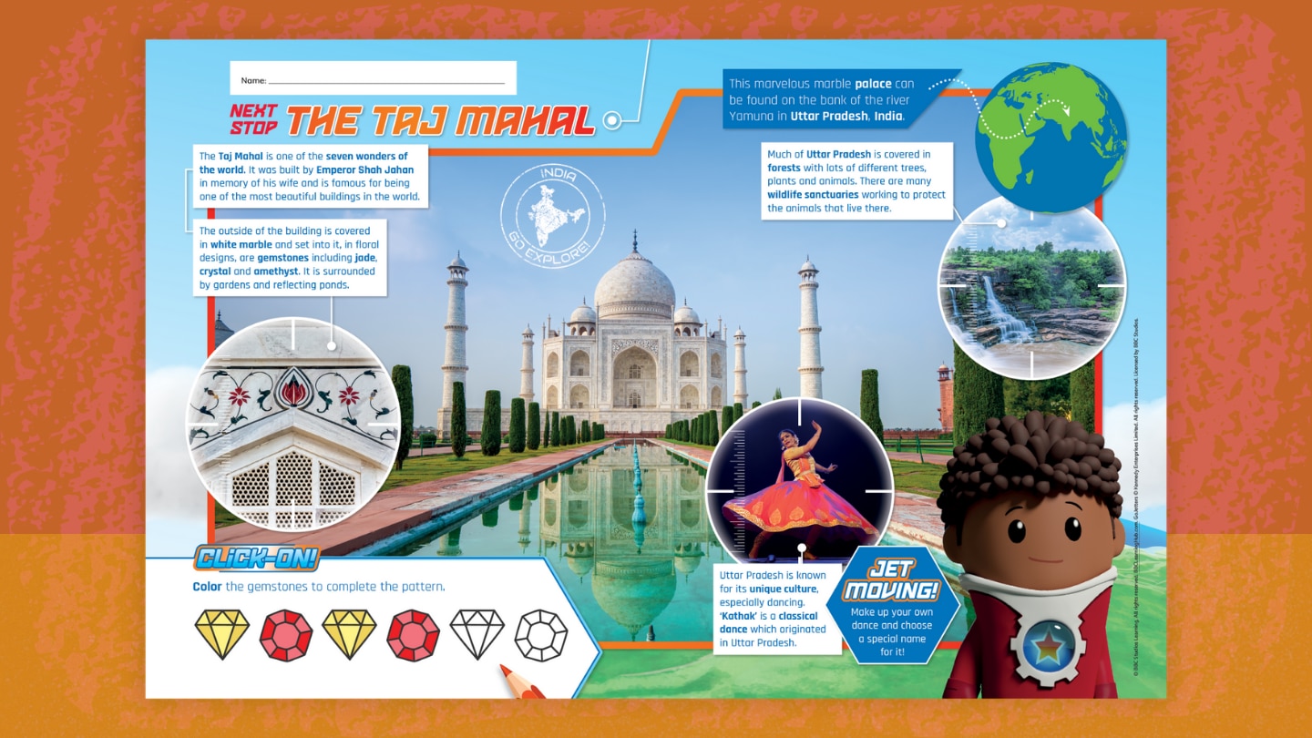 Join the Go Jetters on a journey to India to explore one of the Seven Wonders of the World — the Taj Mahal! In this fun worksheet, you'll: