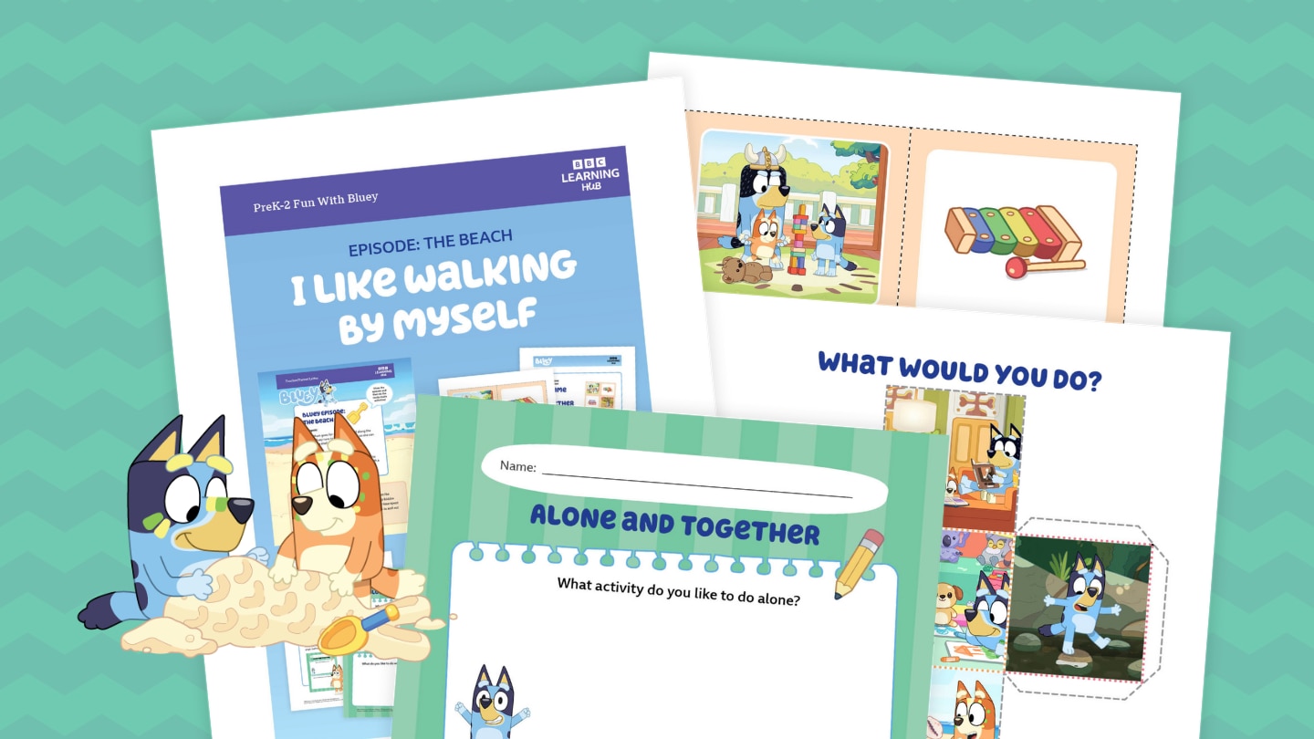 This fun lesson uses the Bluey episode "The Beach" as the kickoff to a classroom conversation about the being alone and with others. Sometimes we like to play together and other times, we want to be by ourselves. And that's OK! The lesson includes printables for three activities in which kids try some activities alone and with a friend, draw a picture of things they like doing alone, and roll a fun Bluey die and share what they'd like to do at each location.